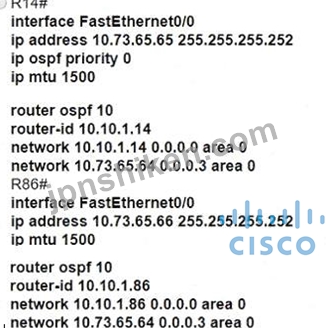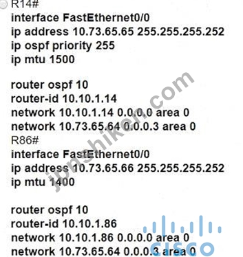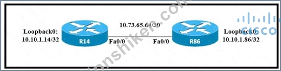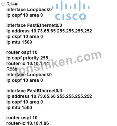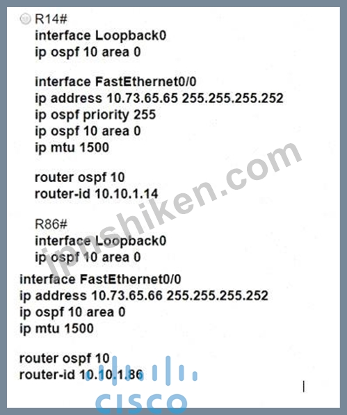 すべてのインターフェイスは、デュプレックス auto および ip ospf ネットワーク ブロードキャストで構成されています。ルーター R14 と R86 が OSPFv2 隣接関係を形成し、ルーター間で OSPF 情報を交換するための中心点として機能できるようにする構成はどれですか?