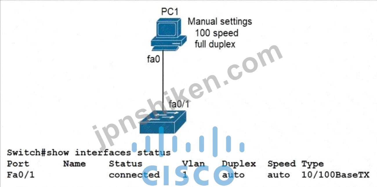 PC1 とスイッチ間のリンクがアップしています。しかし、それはパフォーマンスが悪いです。パフォーマンスの問題を引き起こしているインターフェイスの状態はどれですか?