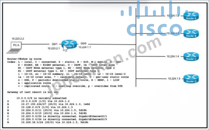 PC A は、IP アドレス 10.227.225.255 の別のデバイスと通信しています。ルーター Y はどのルーターを介してトラフィックをルーティングしますか?