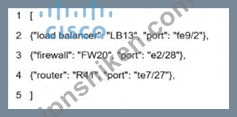 質問457 展示を参照してください。 (Exhibit) JSON出力内の「R1」と「SW1...