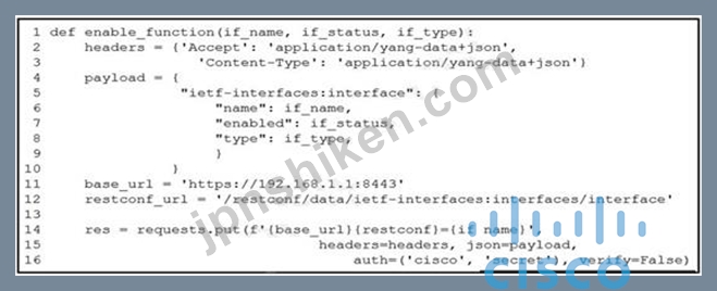 In the provided Python function enable_function, the parameters are if_name, if_status, and if_type, which correspond to the interface name, status (enabled/disabled), and interface type respectively. Function Parameters: The function enable_function is designed to take three parameters: the interface name (if_name), the status (if_status), and the type (if_type). Correct Order and Values: To enable the interface named "Loopback1", you need to pass the correct values in the order they are defined in the function. Option A correctly calls the function with the interface name "Loopback1", the status true (enabled), and the interface type 'iana-if-type:softwareLoopback'. Reference: Cisco DevNet Documentation: RESTCONF and YANG Models