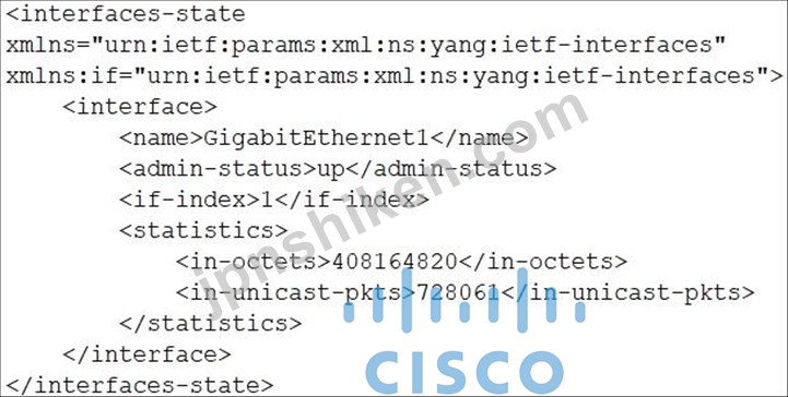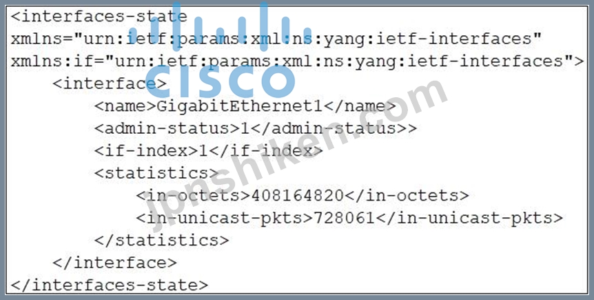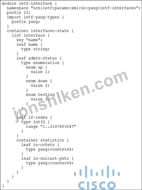 The YANG model provided in the exhibit defines the structure for interface information, including fields for name, admin-status, if-index, and statistics. The correct XML snippet must match this structure and use the appropriate namespaces and field names as defined in the YANG model.