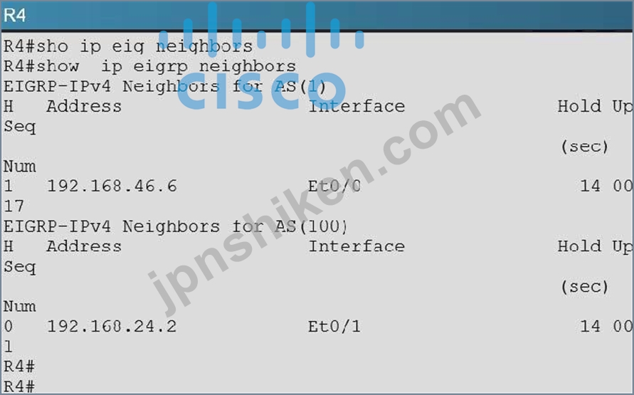 あなたは、EIGRPネットワークのトラブルシューティングに携わってきました。ルータR2とR4の間の最初の問題を解決しましたが、別の問題が残ります。問題を特定し、問題を解決するための解決方法を提案する必要があります。