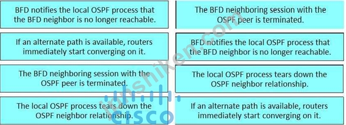 2つのBFDネイバーとOSPFネイバーの間のネットワークで障害が発生します。プロトコルアクションを左から右の正しい順序にドラッグアンドドロップします。