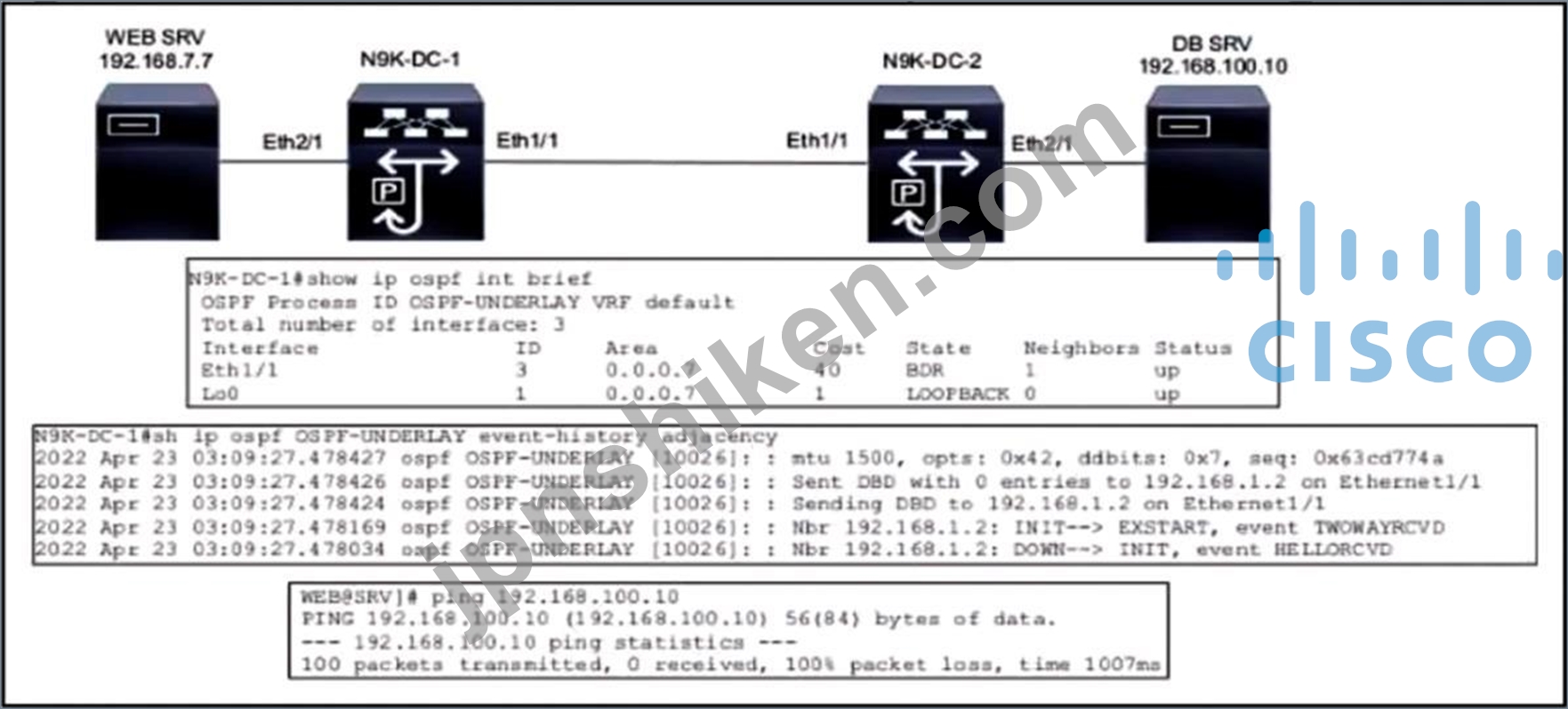 The logs in the exhibit indicate an OSPF adjacency issue between the N9K-DC-1 and N9K-DC-2. Specifically, the transition from INIT to DOWN suggests an MTU mismatch on the direct link between the two devices. OSPF packets include the MTU in their headers. If there is an MTU mismatch, the adjacency process can fail, even if the devices are physically connected and have correct IP configurations. The ip ospf mtu-ignorecommand allows OSPF to ignore MTU mismatches when forming adjacencies, resolving the issue without requiring changes to the MTU configuration on the interfaces.