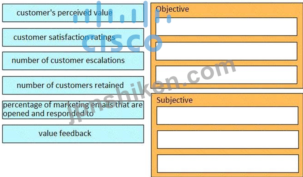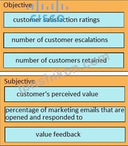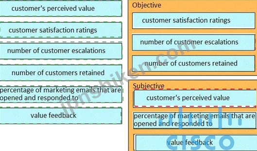 カスタマーサクセスマネージャーは、レビュー会議の準備をしています。顧客は、主観的指標と客観的指標のバランスを求めています。入力を左から右の正しい主観的および客観的カテゴリにドラッグアンドドロップします。