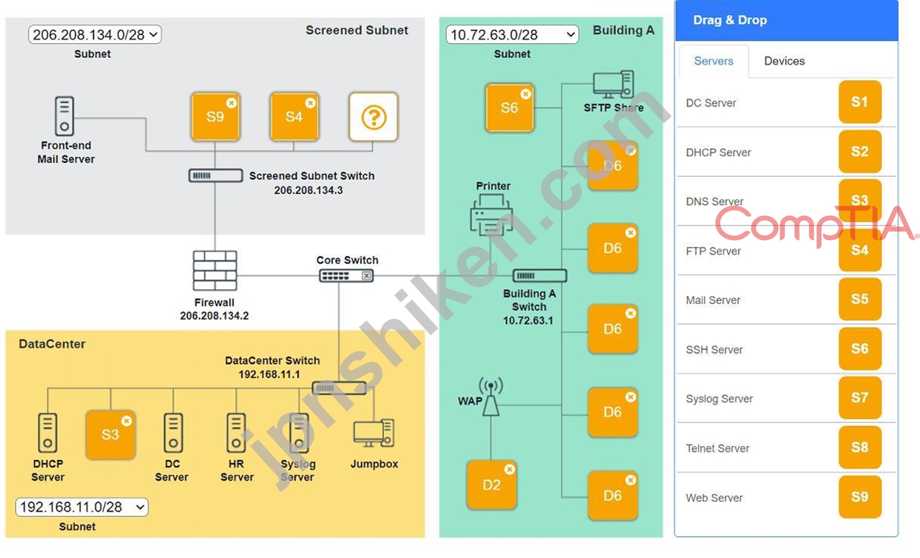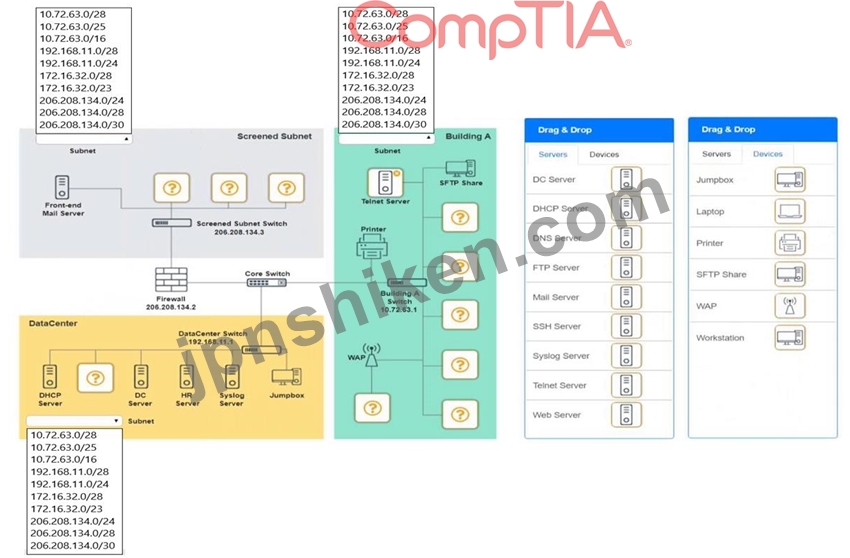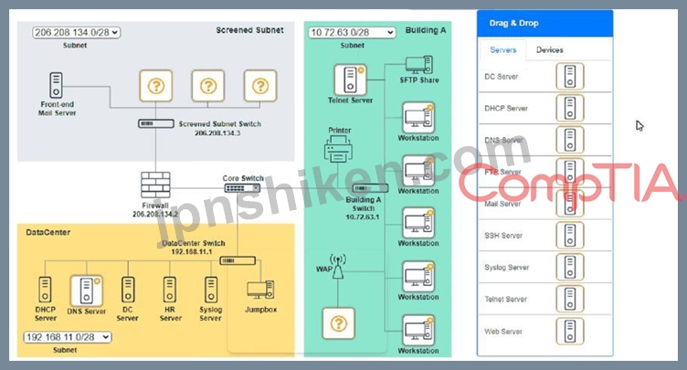 See explanation below. Explanation: Screened Subnet devices - Web server, FTP server Building A devices - SSH server top left, workstations on all 5 on the right, laptop on bottom left DataCenter devices - DNS server. A screenshot of a computer AI-generated content may be incorrect. A screenshot of a computer AI-generated content may be incorrect. A screenshot of a computer AI-generated content may be incorrect.