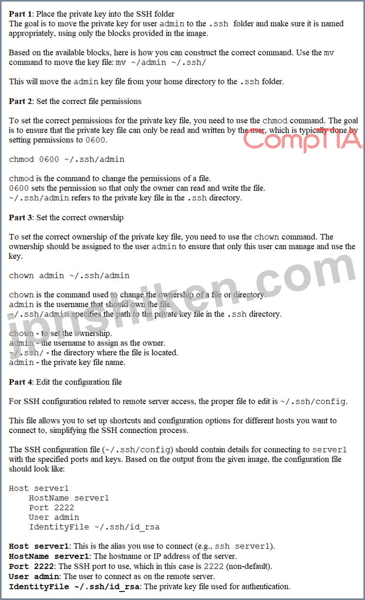 上級管理者がユーザー admin の秘密鍵をホームディレクトリに配置しました。リモートアクセスに必要なサーバーは server1 で、SSH はポート 2222 でリッスンしています。