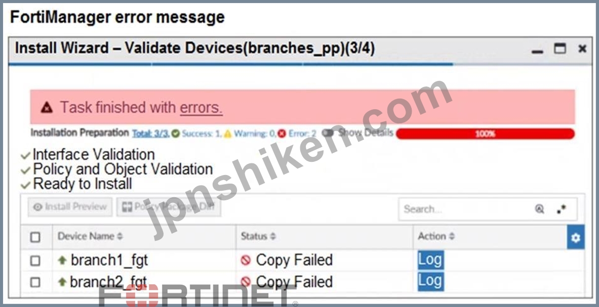 その後、インストールウィザードを使用してブランチデバイスに設定とポリシーパッケージをインストールすると、FortiManagerは3番目の図に示すようにエラーを報告します。FortiManagerがブランチに設定をインストールできなかった理由を説明する記述はどれですか?