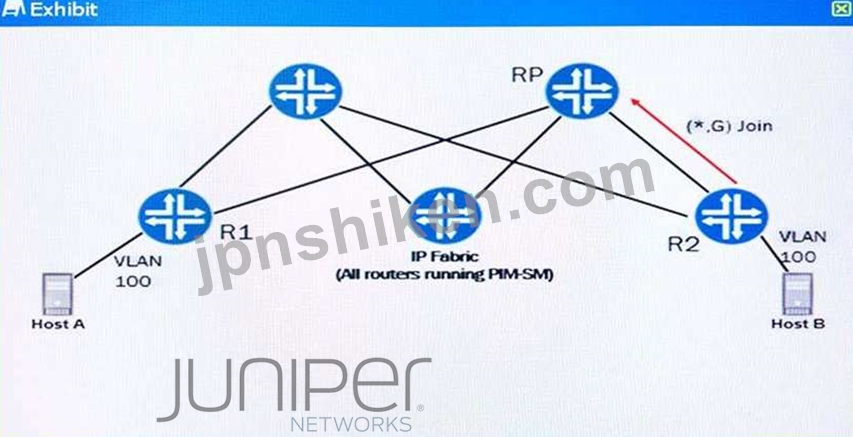 質問22 (Exhibit) 展示を参照すると、R1とR2は、同じVXLANセグメント(V...