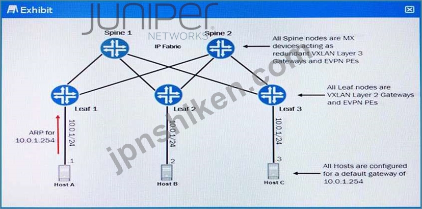 Spine 1およびSpine 2は、仮想ゲートウェイアドレス10.0.1.254のステートメントを使用して冗長VXLANレイヤ3ゲートウェイとして機能するように設定されたMXシリーズデバイスです。この展示を参照して、スパインノードはホストAからのARP要求の受信にどのように反応しますか?