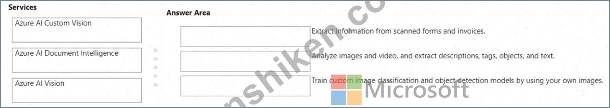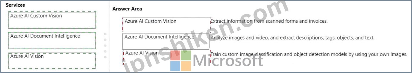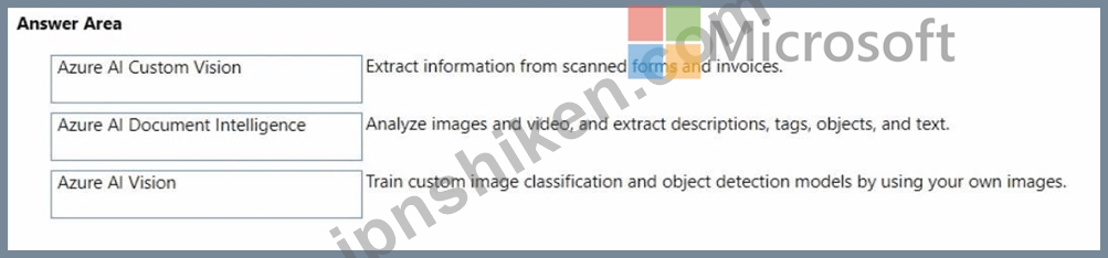 * Azure AI Custom Vision:Custom Vision allows you to train your own image classification and object detection models using your own labeled images. Unlike the general Vision service, Custom Vision lets you build domain-specific models-for example, detecting your company's products or identifying manufacturing defects. Hence, it matches "Train custom image classification and object detection models by using your own images." These three services complement each other within Azure's computer vision ecosystem, collectively supporting both general-purpose and specialized AI solutions for visual data analysis.