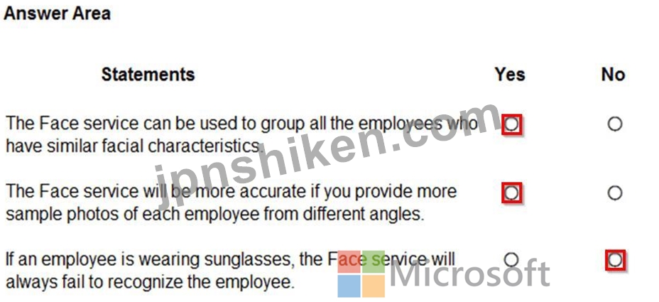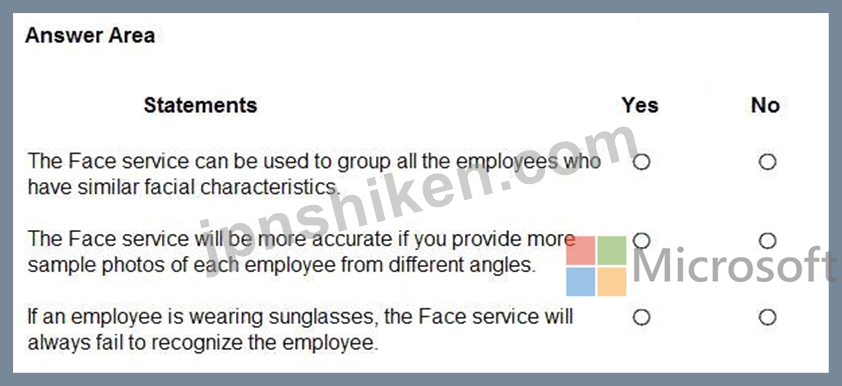 * "If an employee is wearing sunglasses, the Face service will always fail to recognize the employee." # NoThis is incorrect. While occlusions (like sunglasses or hats) can reduce accuracy, the service may still recognize the person depending on how much of the face remains visible. Microsoft Learn explicitly notes that partial occlusion affects recognition confidence but does not guarantee failure.
