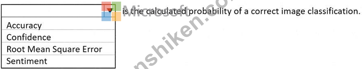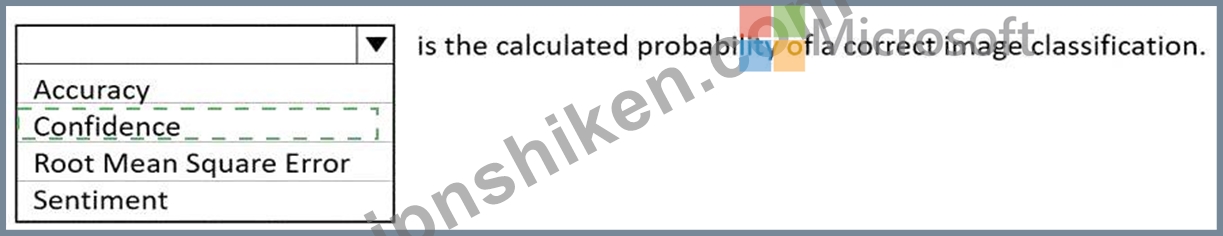 Therefore, based on Microsoft's AI-900 training materials and Azure Cognitive Services documentation, the calculated probability of a correct image classification is called Confidence, which expresses how sure the model is about its prediction for a specific input.
