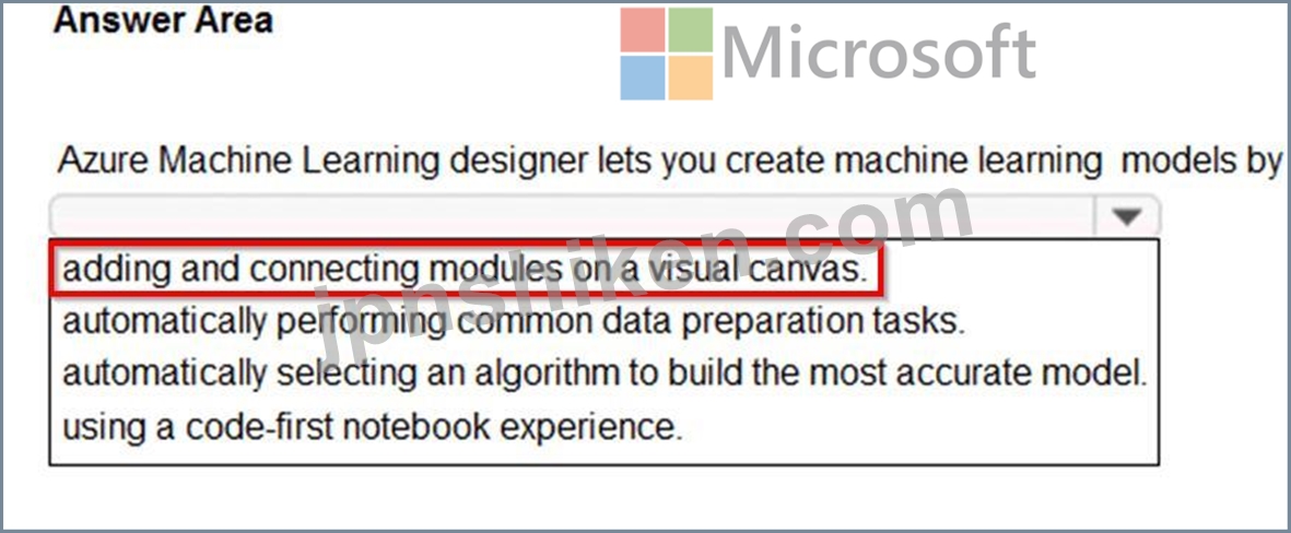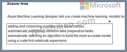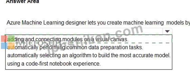 The correct answer is "adding and connecting modules on a visual canvas." According to the Microsoft Azure AI Fundamentals (AI-900) Official Study Guide and the Microsoft Learn module "Explore automated machine learning in Azure Machine Learning," the Azure Machine Learning designer is a drag-and-drop, no-code environment that allows users to create, train, and deploy machine learning models visually. It is specifically designed for users who prefer an intuitive graphical interface rather than writing extensive code.