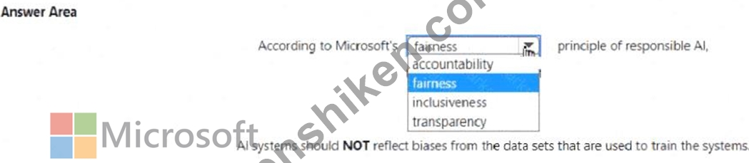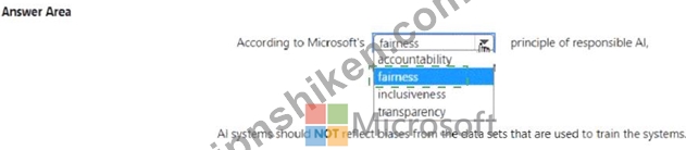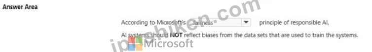 Therefore, the correct answer is fairness, as it directly addresses the principle that AI systems should NOT reflect biases from the datasets used to train them.