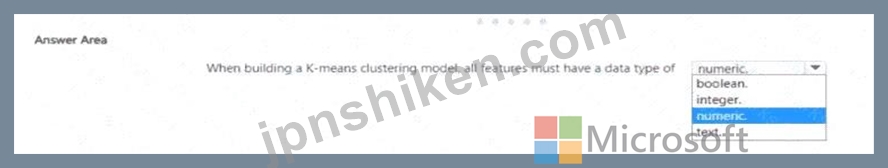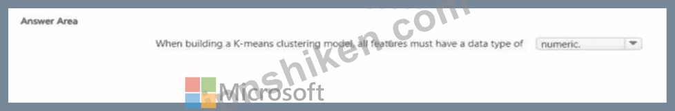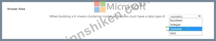 Thus, according to Azure Machine Learning and AI-900 official concepts, all features in a K-means clustering model must be numeric to ensure valid mathematical operations and clustering accuracy.