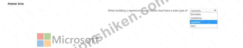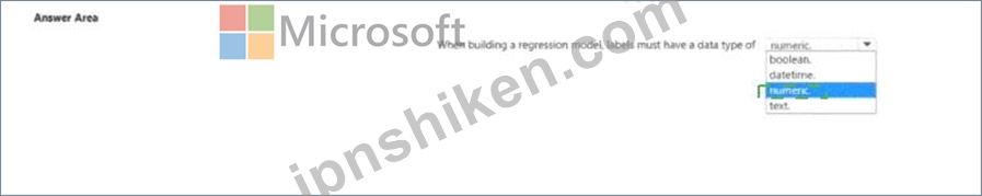 In Azure Machine Learning Designer and AutoML, when building a regression model, the label column must therefore be of numeric data type (integer or float). If the label were categorical (for example, "yes/no" or