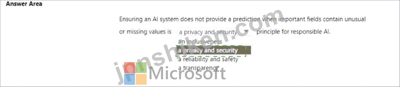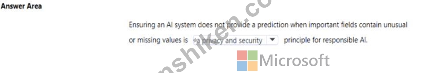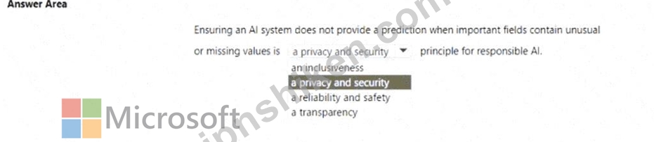 Thus, stopping a prediction when data is incomplete or abnormal directly supports the Reliability and Safety principle - it ensures that the AI model functions correctly under valid conditions and avoids unintended or harmful outcomes.
