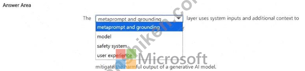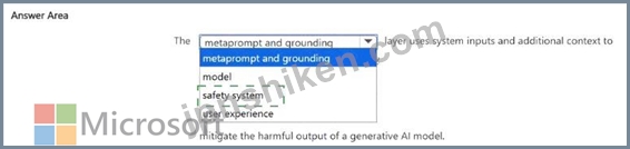 Therefore, the layer that uses system inputs and context to mitigate harmful outputs from a generative AI model is the Safety system layer.