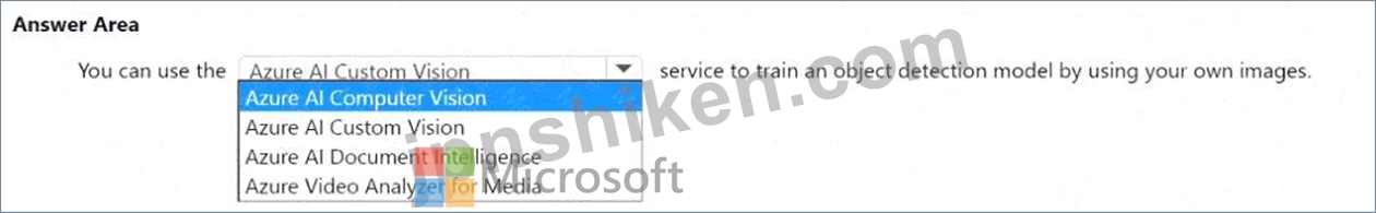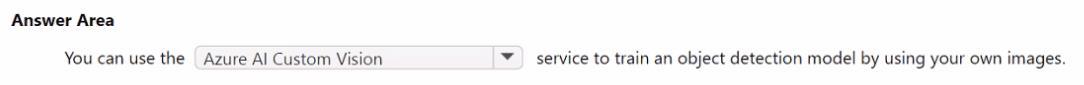 Therefore, when the question specifies "train an object detection model by using your own images," the correct Azure service is Azure AI Custom Vision, as it provides the necessary tools for training, evaluating, and deploying custom computer vision models tailored to a user's dataset.