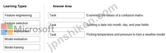 This question tests your understanding of machine learning workflow tasks as described in the Microsoft Azure AI Fundamentals (AI-900) study guide and the Microsoft Learn module "Explore the machine learning process." The AI-900 curriculum divides the machine learning lifecycle into key phases: data preparation, feature engineering and selection, model training, model evaluation, and model deployment. Each phase has specific tasks designed to prepare, build, and assess predictive models before deployment.