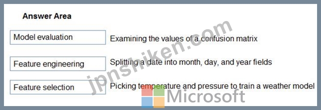 * Picking temperature and pressure to train a weather model # Feature selectionFeature selection involves identifying the most relevant variables that have predictive power for the model. As defined in Microsoft Learn, "feature selection is the process of choosing the most useful subset of input features for training." In this scenario, selecting temperature and pressure variables as inputs for a weather prediction model fits perfectly within the feature selection stage.