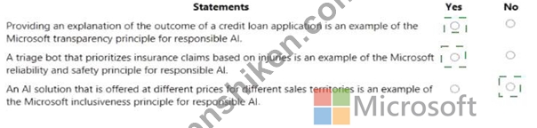 * Inclusiveness Principle - NoAn AI solution priced differently for various sales territories is unrelated to inclusiveness. Inclusiveness focuses on designing AI systems that are accessible and fair to all users, including those with disabilities or from different demographic backgrounds. Price variation across territories is a business strategy, not an ethical AI inclusion concern. Hence, this statement does not align with any Responsible AI principle.