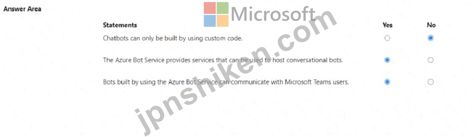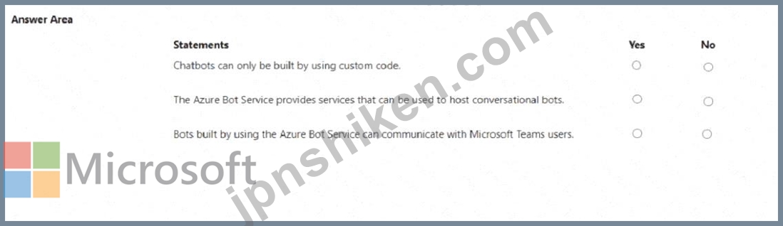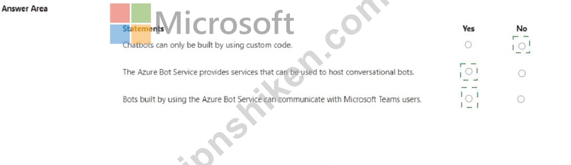The third statement is also True (Yes) because Azure Bot Service supports integration with Microsoft Teams, among many other channels such as Skype, Facebook Messenger, Slack, and web chat. Microsoft documentation states that Azure-hosted bots can communicate directly with Teams users through the Teams channel, enabling intelligent virtual assistants within the Teams environment.