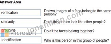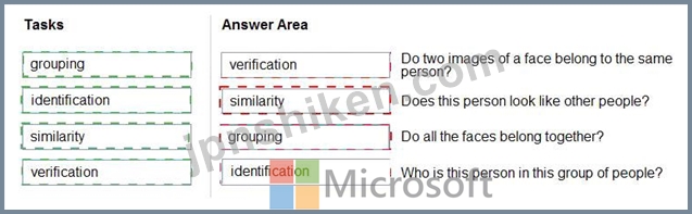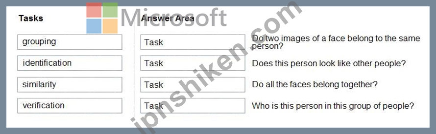 The correct matches are based on the Microsoft Azure AI Fundamentals (AI-900) Official Study Guide and the Microsoft Learn module "Explore computer vision in Microsoft Azure." These materials explain that facial recognition tasks can be categorized into four major operations: verification, identification, similarity, and grouping. Each task serves a distinct purpose in facial recognition scenarios.