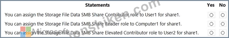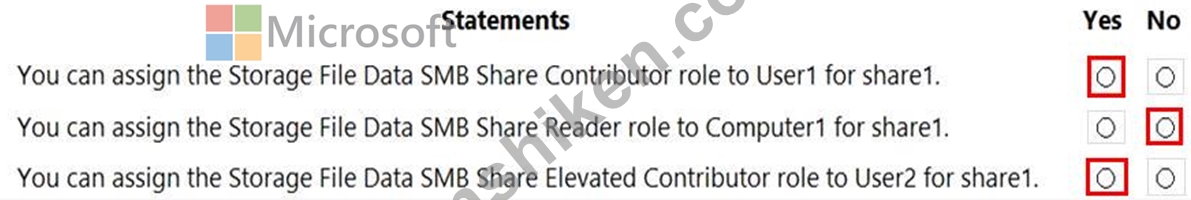 storage1という名前のストレージアカウントを含むAzureサブスクリプションがあります。サブスクリプションは、オンプレミスのActiveDirectoryドメインに同期するcontoso.comという名前のAzureActive Directory(Azure AD)テナントにリンクされています。