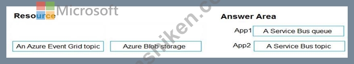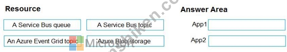 Explanation: App1: A service Bus queue In Queues each message is processed by a single consumer. App2: A Service Bus topic In contrast to queues, in which each message is processed by a single consumer, topics and subscriptions provide a one-to-many form of communication, in a publish/subscribe pattern. References: https://www.codit.eu/blog/exploring-azure-event-grid-are-service-bus-topic-dead/