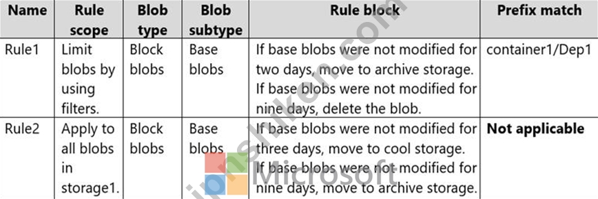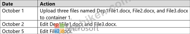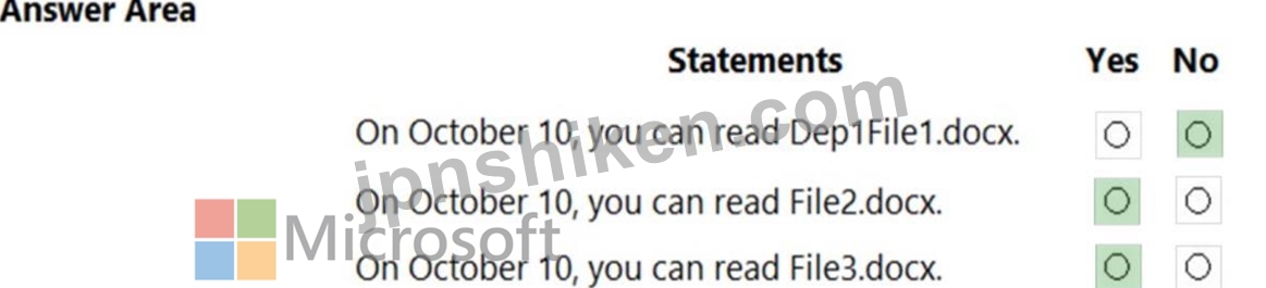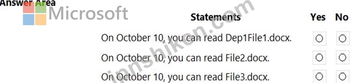 Explanation: Box 1: No Dep1File1.docx is in archive, meaning the only way to pull it out and read it is to "rehydrate" the file. Box 2: Yes File2 and File3 can continue to be read, even in the cool tier. Box 3: Yes File2 and File3 can continue to be read, even in the cool tier. Reference: https://docs.microsoft.com/en-us/azure/storage/blobs/archive-rehydrate-overview