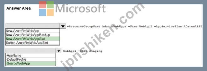 Explanation: Box 1: New-AzureRmWebAppSlot The New-AzureRmWebAppSlot cmdlet creates an Azure Web App Slot in a given a resource group that uses the specified App Service plan and data center. Box 2: -SourceWebApp References: https://docs.microsoft.com/en-us/powershell/module/azurerm.websites/new-azurermwebappslot