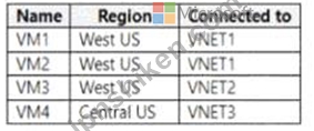 VNET1、VNET2、VNET3 という 3 つの仮想ネットワークを含む Azure サブスクリプションがあります。仮想ネットワークはピアリングされ、オンプレミス ネットワークに接続されています。サブスクリプションには、次の表に示す仮想マシンが含まれています。