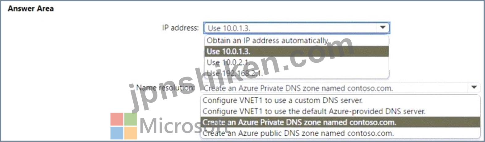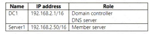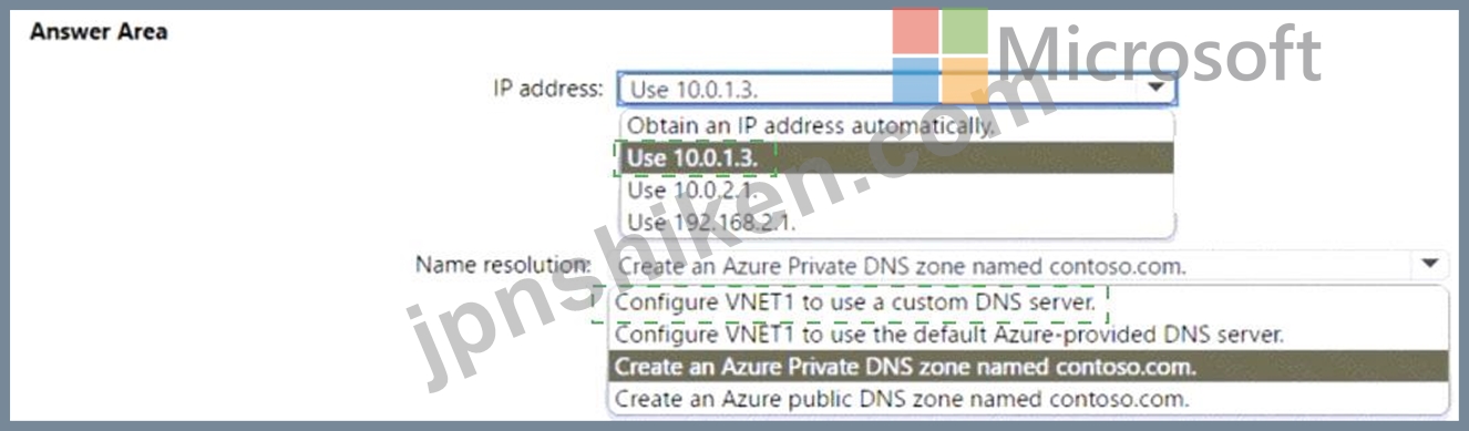 IP address: You should use 10.0.1.3 as the IP address for DC1. This is because DC1 needs to have a static IP address within the subnet range of VNET1, which is 10.0.1.0/241. You cannot use 10.0.2.1 or 192.168.2.1, as they are outside of the subnet range of VNET1. You also cannot obtain an IP address automatically, as this may cause DC1 to lose its IP address and break the DNS resolution for the domain members2.