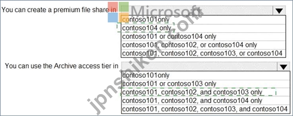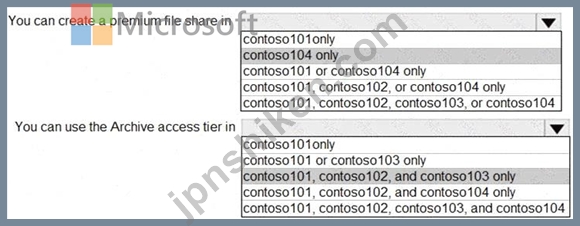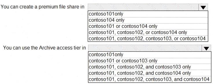 Explanation: Box 1: contoso104 only Premium file shares are hosted in a special purpose storage account kind, called a FileStorage account. Box 2: contoso101, contoso102, and contos103 only Reference: https://docs.microsoft.com/en-us/azure/storage/files/storage-how-to-create-premium-fileshare?tabs=azure- portal https://docs.microsoft.com/en-us/azure/storage/blobs/storage-blob-storage-tiers