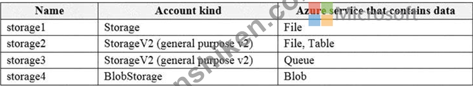 Azure Import/Export service supports the following of storage accounts: # Standard General Purpose v2 storage accounts (recommended for most scenarios) # Blob Storage accounts # General Purpose v1 storage accounts (both Classic or Azure Resource Manager deployments), Azure Import/Export service supports the following storage types: # Import supports Azure Blob storage and Azure File storage # Export supports Azure Blob storage. Azure Files not supported. Only storage4 can be exported. Reference: https://docs.microsoft.com/en-us/azure/storage/common/storage-import-export-requirements