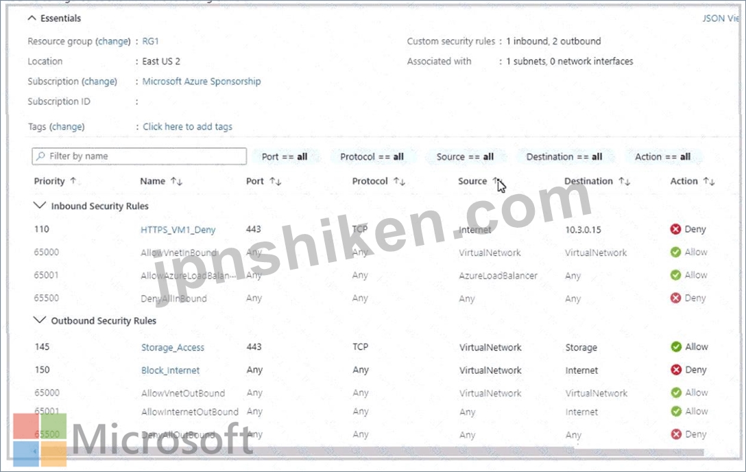No- You have a Inbound deny rule for VM1 from the the internet with a destination of the 10.3.0.15 which is in Subnet1. This proves the NSG is associated to Subnet1 and only subnet one because the image shows it is connected to only 1 subnet. VM2 is on Subnet2 which you can determined by its IP address. This means that NSG1 does not apply to VM2.