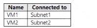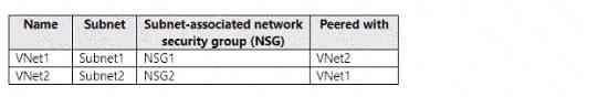 WebApp2 can communicate with VM1. Yes, this is correct. According to the tables, WebApp2 is integrated with VNet3, which has a peering connection with VNet2. VM1 is in Subnet2 in VNet2, which has a network security group named NSG2 that allows inbound traffic from any source on port 803. Therefore, WebApp2 can communicate with VM1 on port 80 across peered virtual networks.