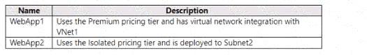 WebApp1 can communicate with VM2. No, this is not correct. According to the tables, WebApp1 is integrated with VNet1, which has a peering connection with VNet2. However, VM2 is in VNet3, which is not peered with VNet1 or VNet2. Therefore, WebApp1 cannot communicate with VM2 across different virtual networks1.