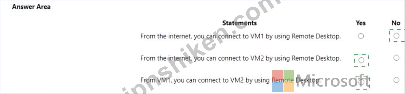 VM1 と VM2 はパブリック IP アドレスを使用します。VM1 と VM2 上の Windows Server 2019 から、受信リモートデスクトップ接続を許可します。