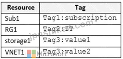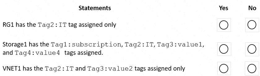 VNET1 has the Tag2: IT and Tag3: value2 tags assigned only. Yes, this is correct. According to the tables, VNET1 has two tags assigned: Tag2: IT and Tag3: value2. The Azure policy does not affect VNET1, because it is excluded from the scope of the policy. Therefore, VNET1 does not have the Tag4: value4 tag appended by the policy.