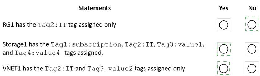 RG1 has the Tag2: IT tag assigned only. No, this is not correct. According to the tables, RG1 has two tags assigned: Tag2: IT and Tag3: value2. The Azure policy does not affect RG1, because it is excluded from the scope of the policy. Therefore, RG1 does not have the Tag4: value4 tag appended by the policy.