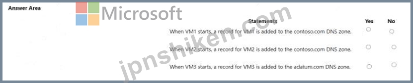 None of the VM will auto-register to the public Azure DNS zone named adatum.com. You cannot register private IPs on the internet (adatum.com) Box 1: Yes Auto registration is enabled for private Azure DNS zone named contoso.com.