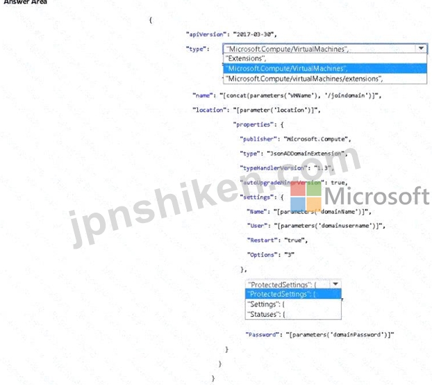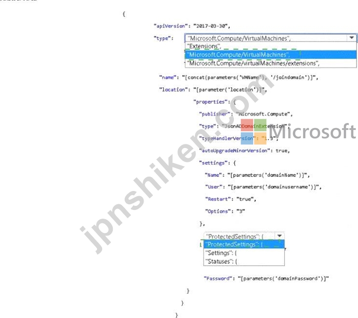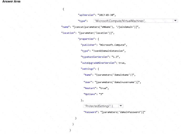 Azure Resource Manager (ARM) テンプレートをどのように完了すればよいですか? 回答するには、回答領域で適切なオプションを選択してください。