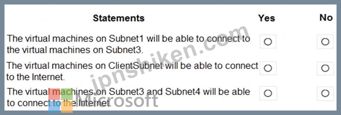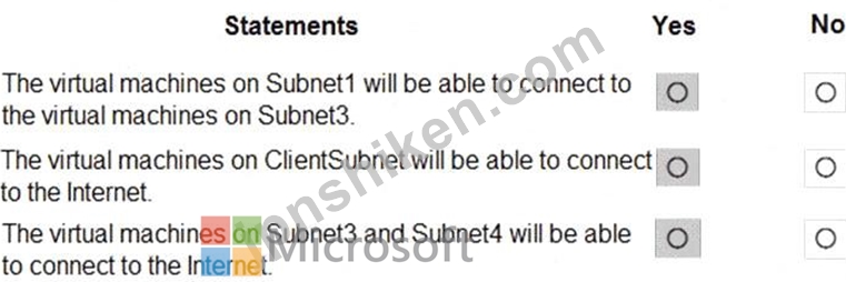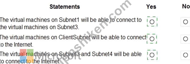 All Azure resources connected to a VNet have outbound connectivity to the Internet by default. Therefore VMs on ClientSubnet, which is on ClientResources-VNet will have access to the Internet; and VMs on Subnet3 and Subnet4, which are on AllOffices-VNet will have access to the Internet.