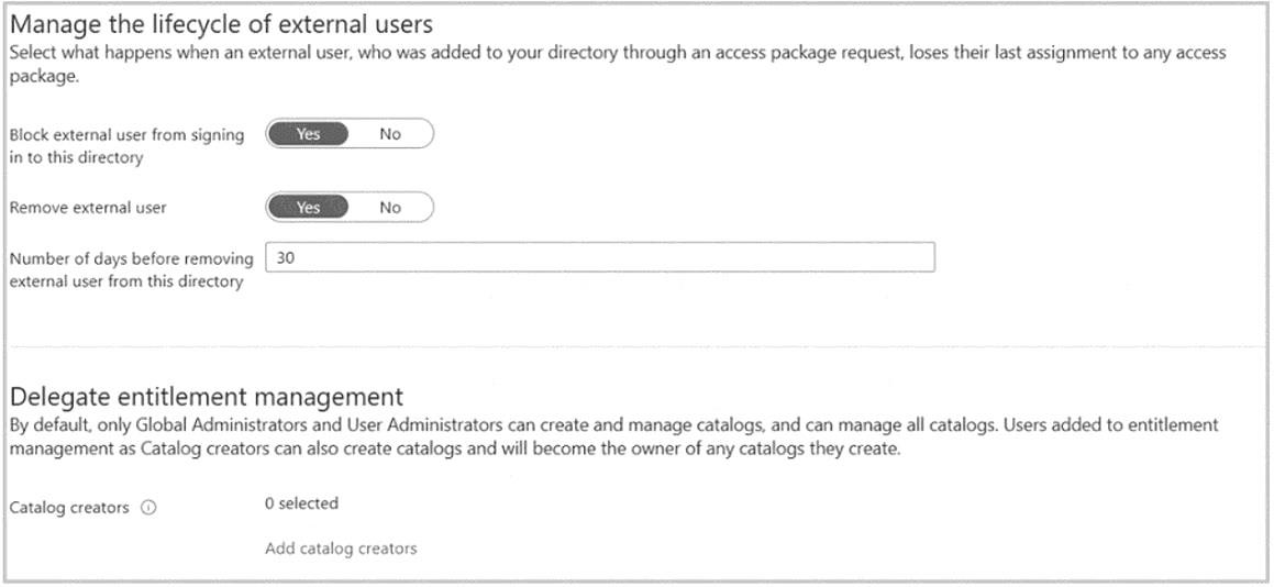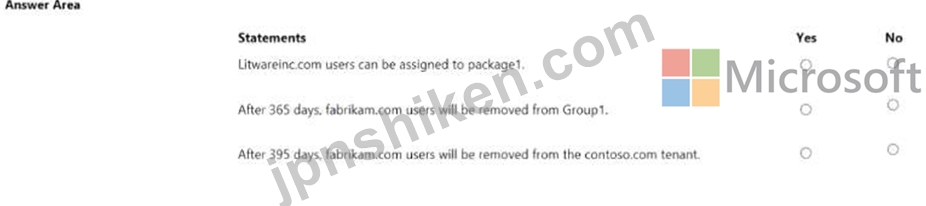After 395 days, fabrikam.com users will be removed from the contoso.com tenant = No Litwareinc.com users cannot be assigned to package1 because they are not a connected organization in the contoso.com tenant. Only users from connected organizations can request access packages that are configured for external users1 Fabrikam.com users will be removed from Group1 after 365 days because the access package has an expiration policy of 365 days for external users. This means that the access assignments for external users will end after 365 days, unless they are renewed or extended2 Fabrikam.com users will not be removed from the contoso.com tenant after 395 days because the external user lifecycle settings have a deletion policy of 30 days after blocking. This means that external users will be blocked from signing in after 365 days of inactivity, and then deleted after another 30 days. Therefore, the total time before deletion is 395 days of inactivity, not 395 days from the date of assignment3