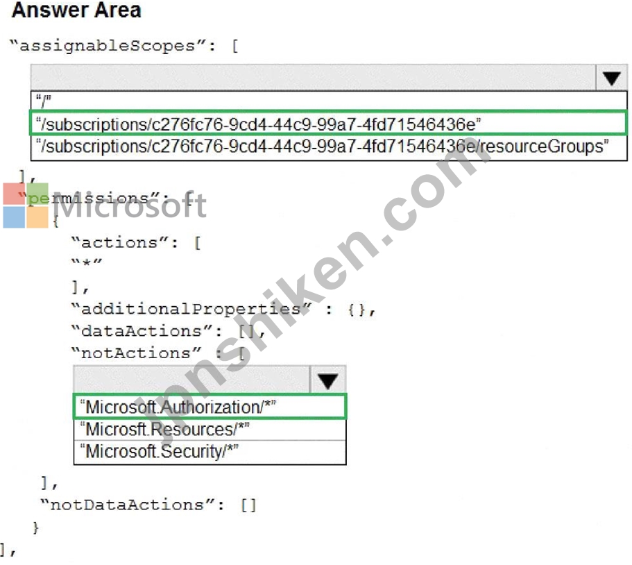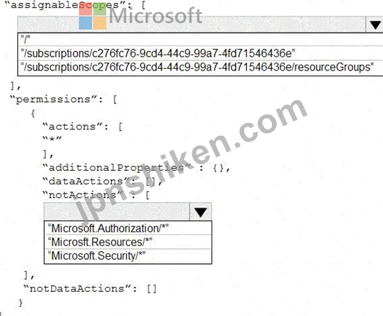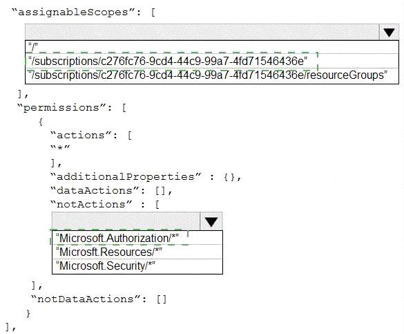 In the assignableScopes you need to mention the subscription ID where you want to implement the RBAC Box 2: "Microsoft.Authorization/*" Microsoft.Authorization/* is used to Manage authorization
