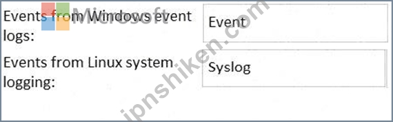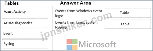 どのLogAnalyticsテーブルをクエリする必要がありますか?答えるには、適切なテーブルを正しいログタイプにドラッグします。各値は、1回使用することも、複数回使用することも、まったく使用しないこともできます。コンテンツを表示するには、分割バーをペイン間でドラッグするか、スクロールする必要がある場合があります。